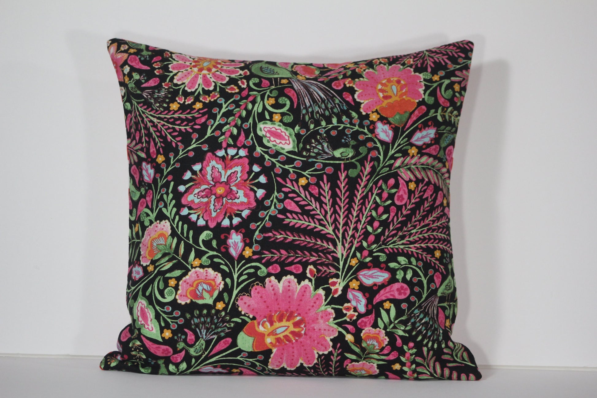 Dana Gibson’s Big Ditty design in the persimmon colorway is paired with panels of orange linen and backed with Dena Home’s Peaceful Perch print on a black ground – the party is on both sides of the pillow! With its bright colors and suggestions of the tropics, this pillow cover could easily fit into a sunroom or child’s room but will be just as joyful and welcoming wherever you choose to display it.