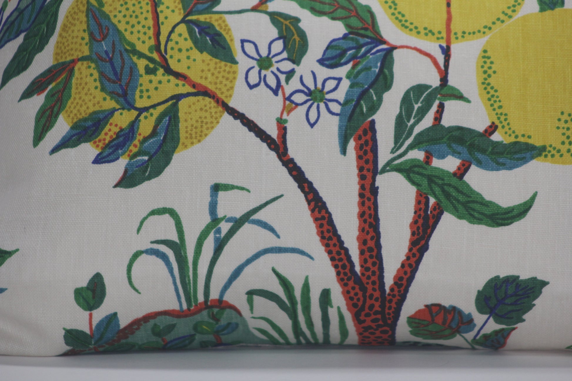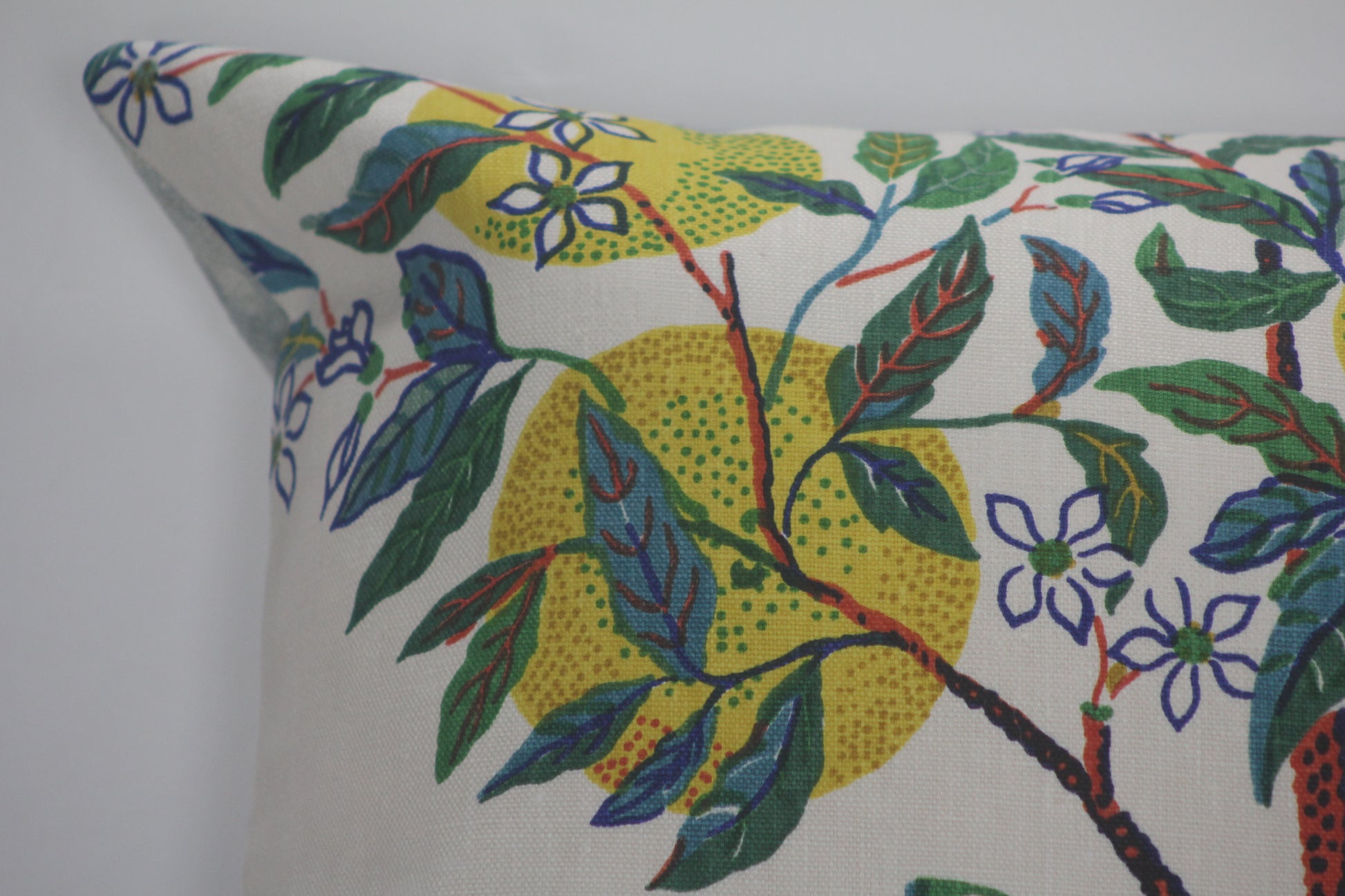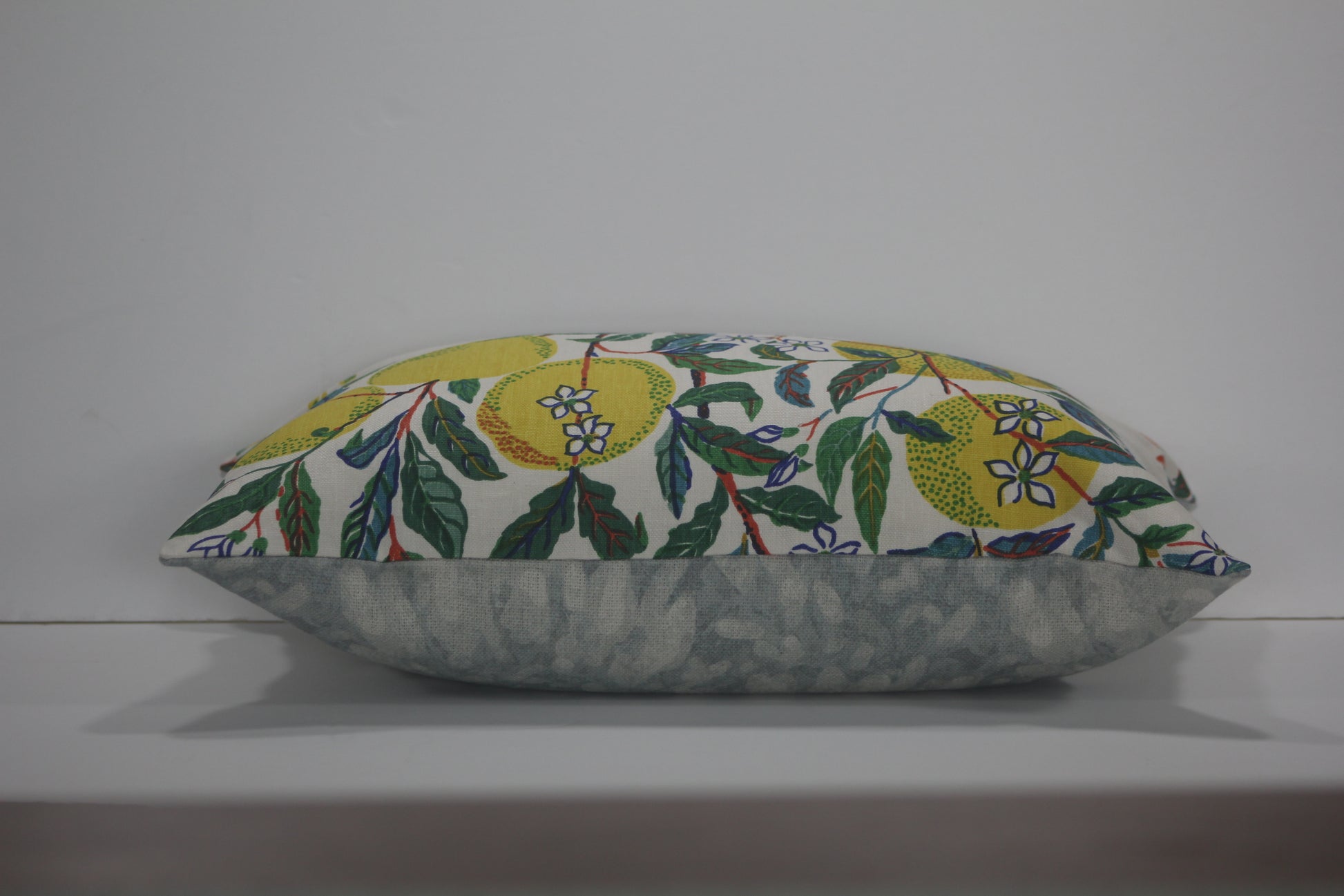 Designs by two iconic designers meet on these very special lumbar pillow covers. In 1947 Josef Frank designed Citrus Garden for Schumacher, which reissued the archival print for their 125th anniversary in the “primary” colorway. The hand-drawn motif portrays a garden of citrus trees reimagined in bright yellows, reds, greens, and blues printed on 100% linen. The other side of the pillow cover has Barbara Barry’s Merida design from her partnership with Kravet Couture. Merida, in a washed teal colorway printed on a 80% cotton/20% linen blend, is a design you can easily get lost in, with its pale, almost-neutral, colors, quiet movement, and amorphous shapes. This is a very limited edition: only three pillow covers are available, and design placement will vary.