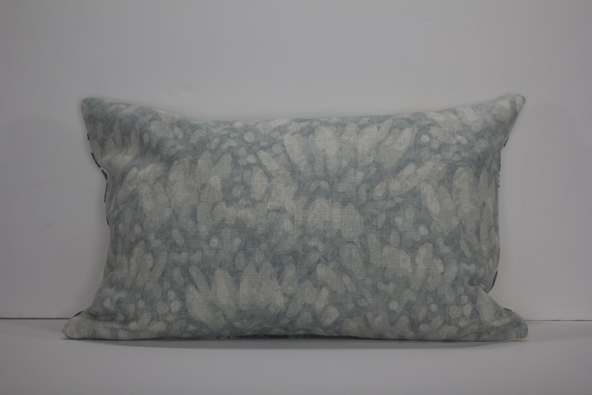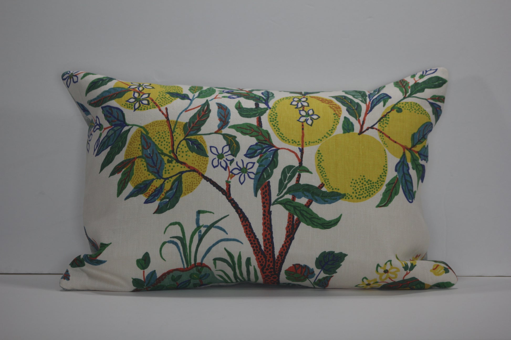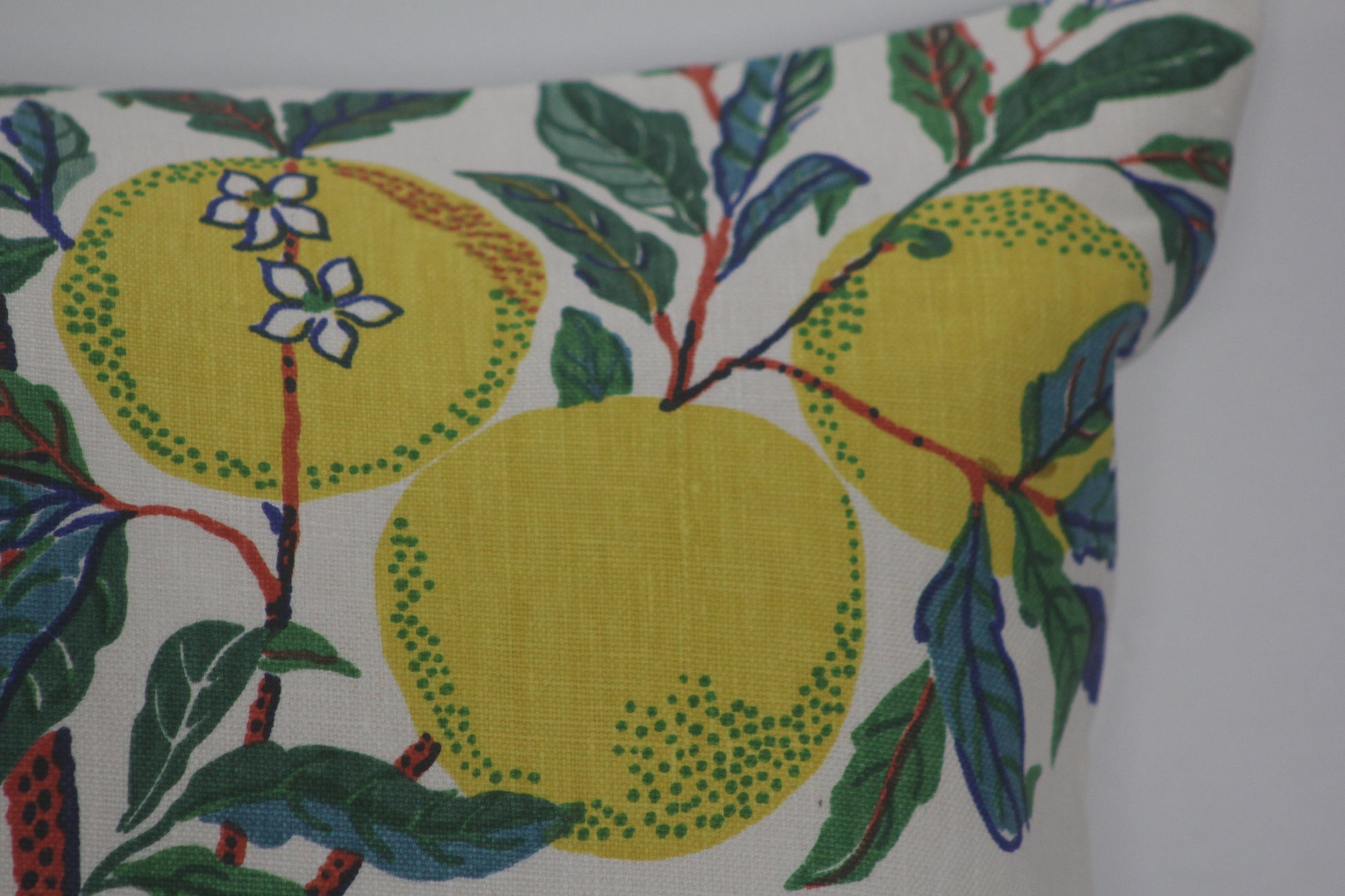 Designs by two iconic designers meet on these very special lumbar pillow covers. In 1947 Josef Frank designed Citrus Garden for Schumacher, which reissued the archival print for their 125th anniversary in the “primary” colorway. The hand-drawn motif portrays a garden of citrus trees reimagined in bright yellows, reds, greens, and blues printed on 100% linen. The other side of the pillow cover has Barbara Barry’s Merida design from her partnership with Kravet Couture. Merida, in a washed teal colorway printed on a 80% cotton/20% linen blend, is a design you can easily get lost in, with its pale, almost-neutral, colors, quiet movement, and amorphous shapes. This is a very limited edition: only three pillow covers are available, and design placement will vary.