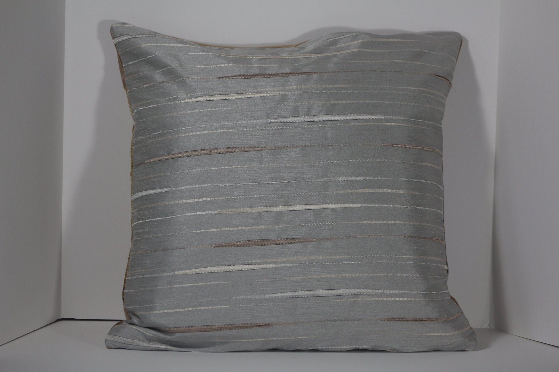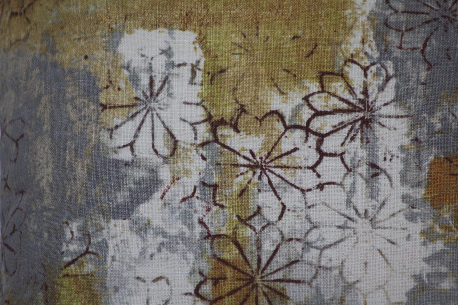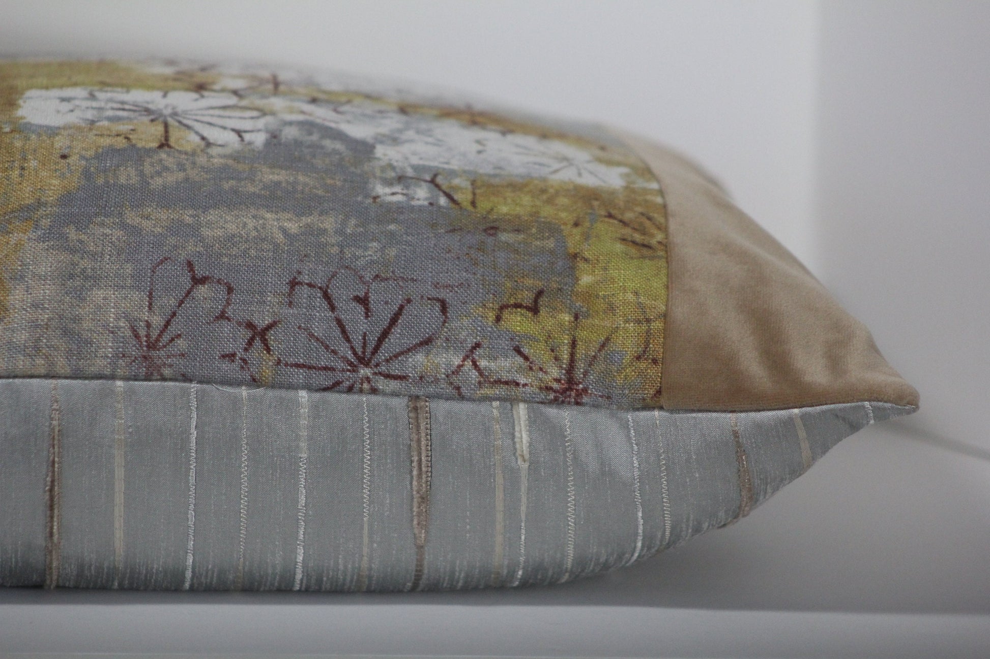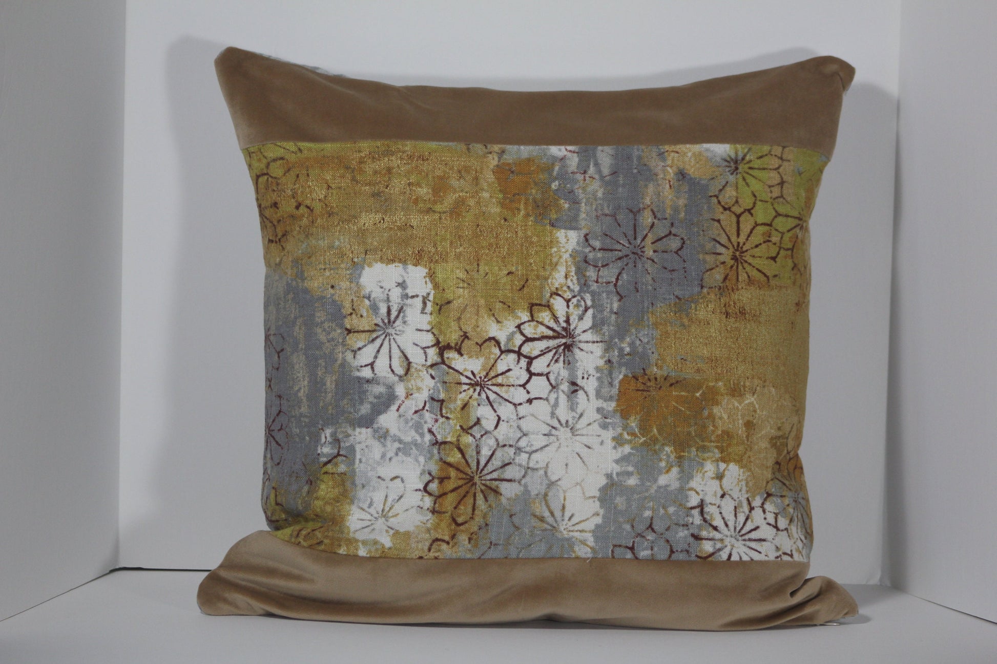 A silver and gold floral panel from Covington’s Reactive Dyes fabric line is complemented with panels of soft camel colored velvet and backed with a textured grey shot silk. We’ve made four unique pillow covers with this same floral print and grey silk back. Alone or combined, they can introduce an autumnal or holiday mood to your room or add a midcentury vibe year-round.