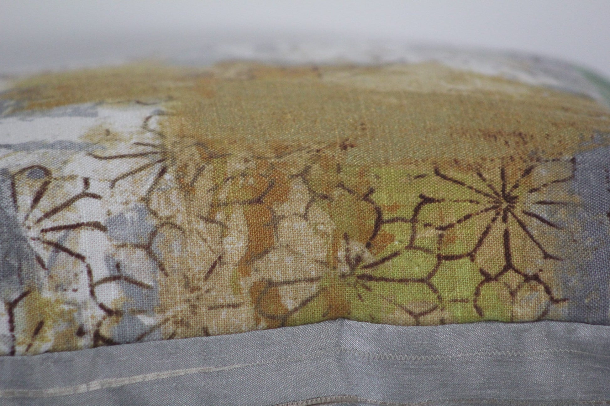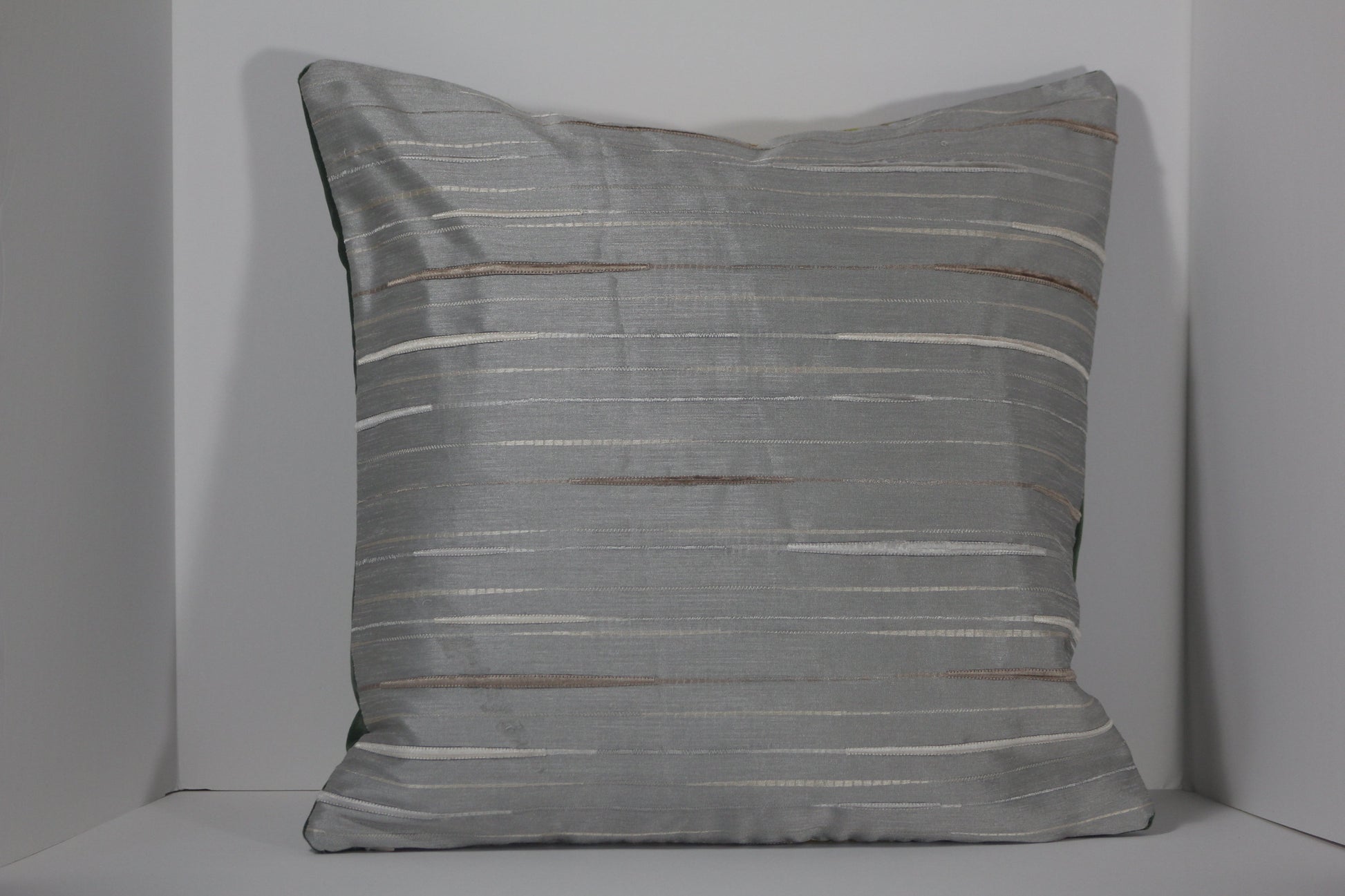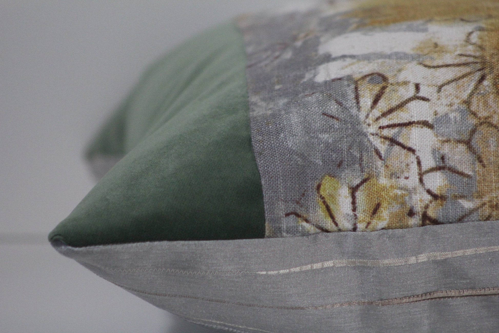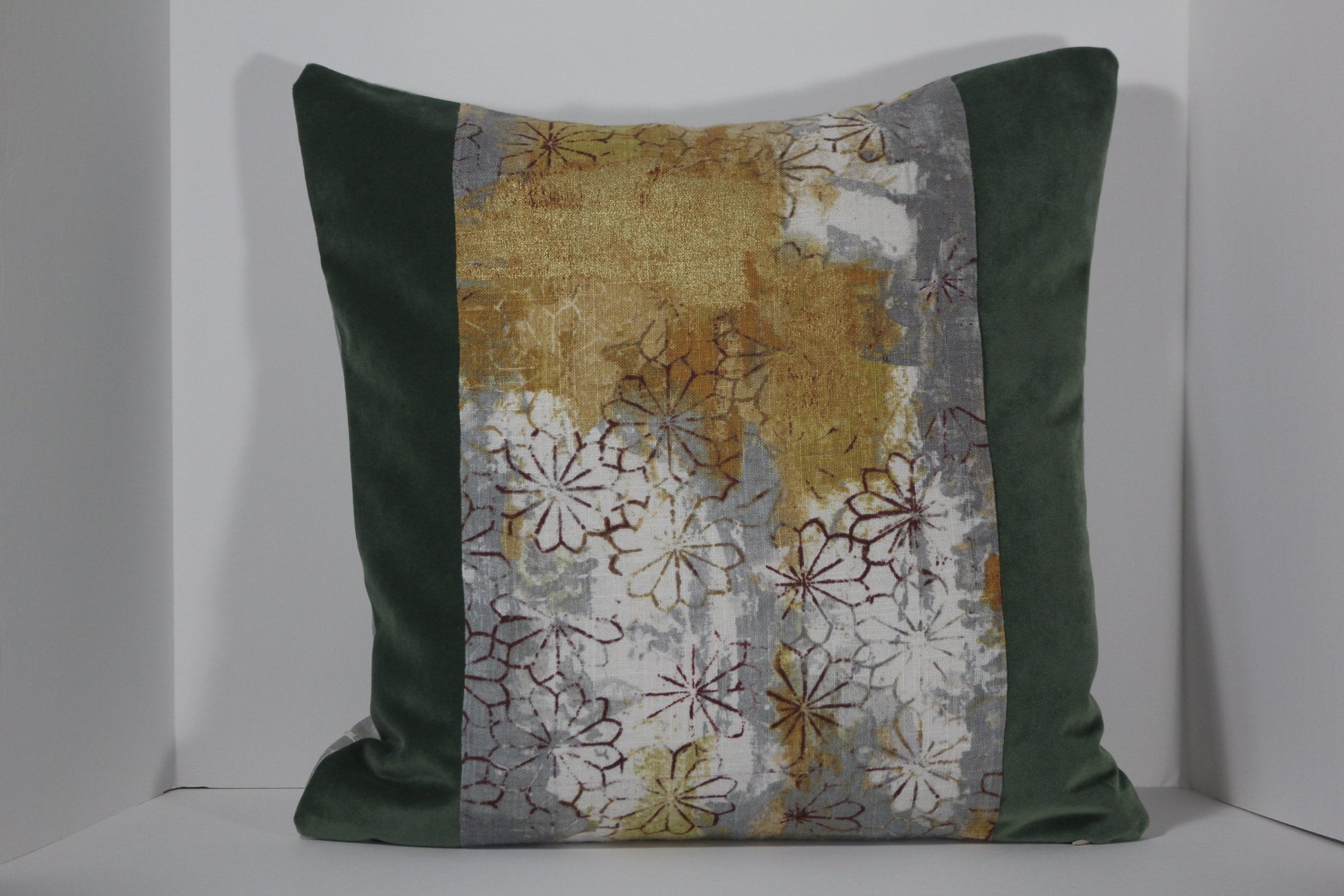 A silver and gold floral panel from Covington’s Reactive Dyes fabric line is partnered with panels of soft emerald green velvet and backed with a textured grey shot silk. We’ve made four unique pillow covers with this same floral print and grey silk back. Alone or combined, they can introduce an autumnal or holiday mood to your room or add a midcentury vibe year-round.
