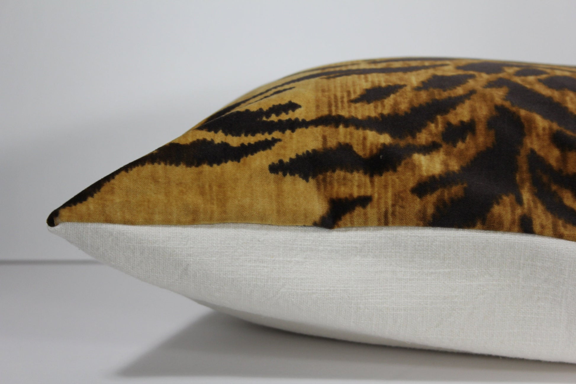 We’ve combined two unexpected partners for this pillow cover: Braemore’s extravagant tiger printed velvet with Kravet's geometric white embroidery on grey linen. With such a big story on the front, we backed the cover in simple white linen.