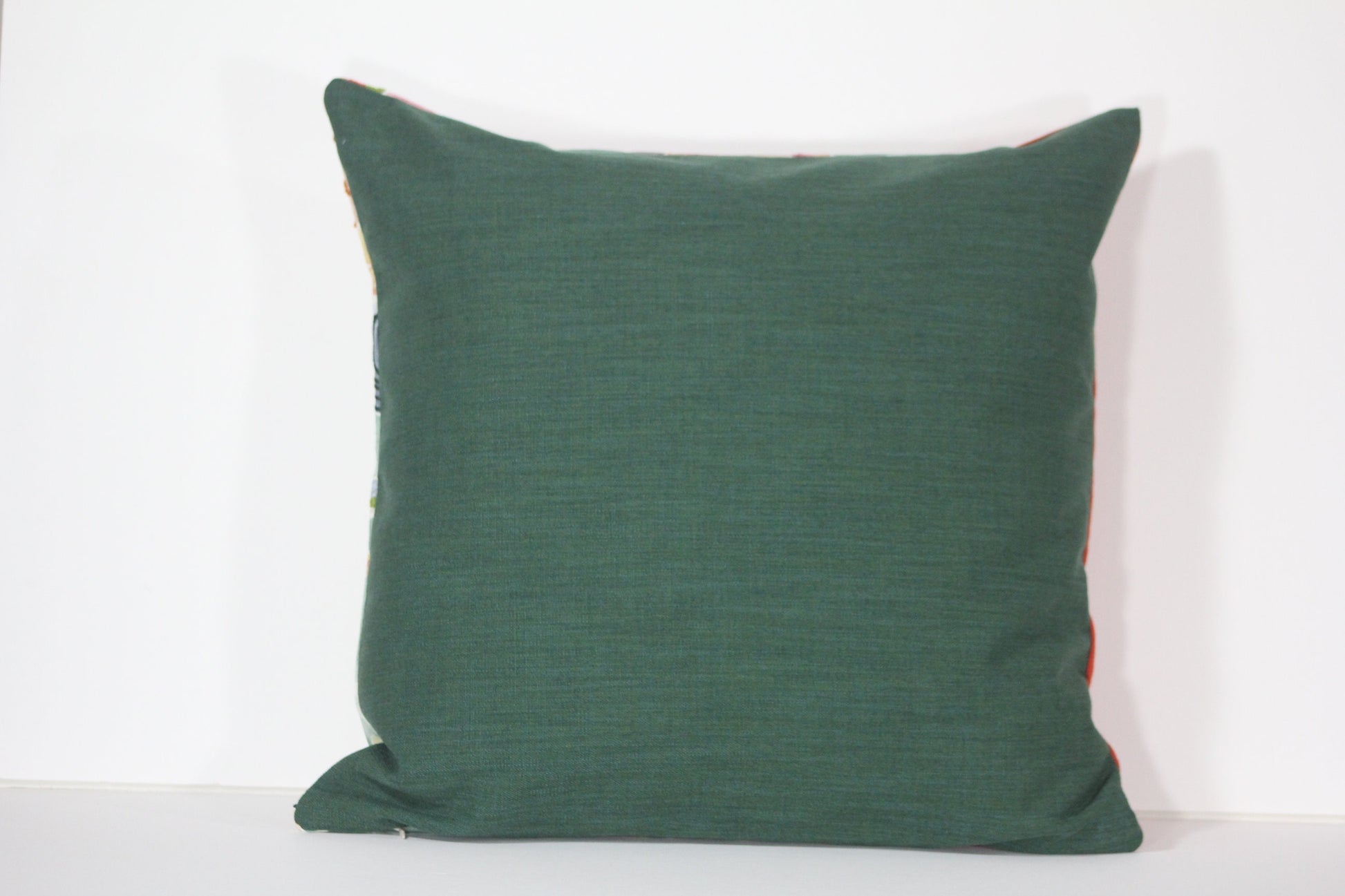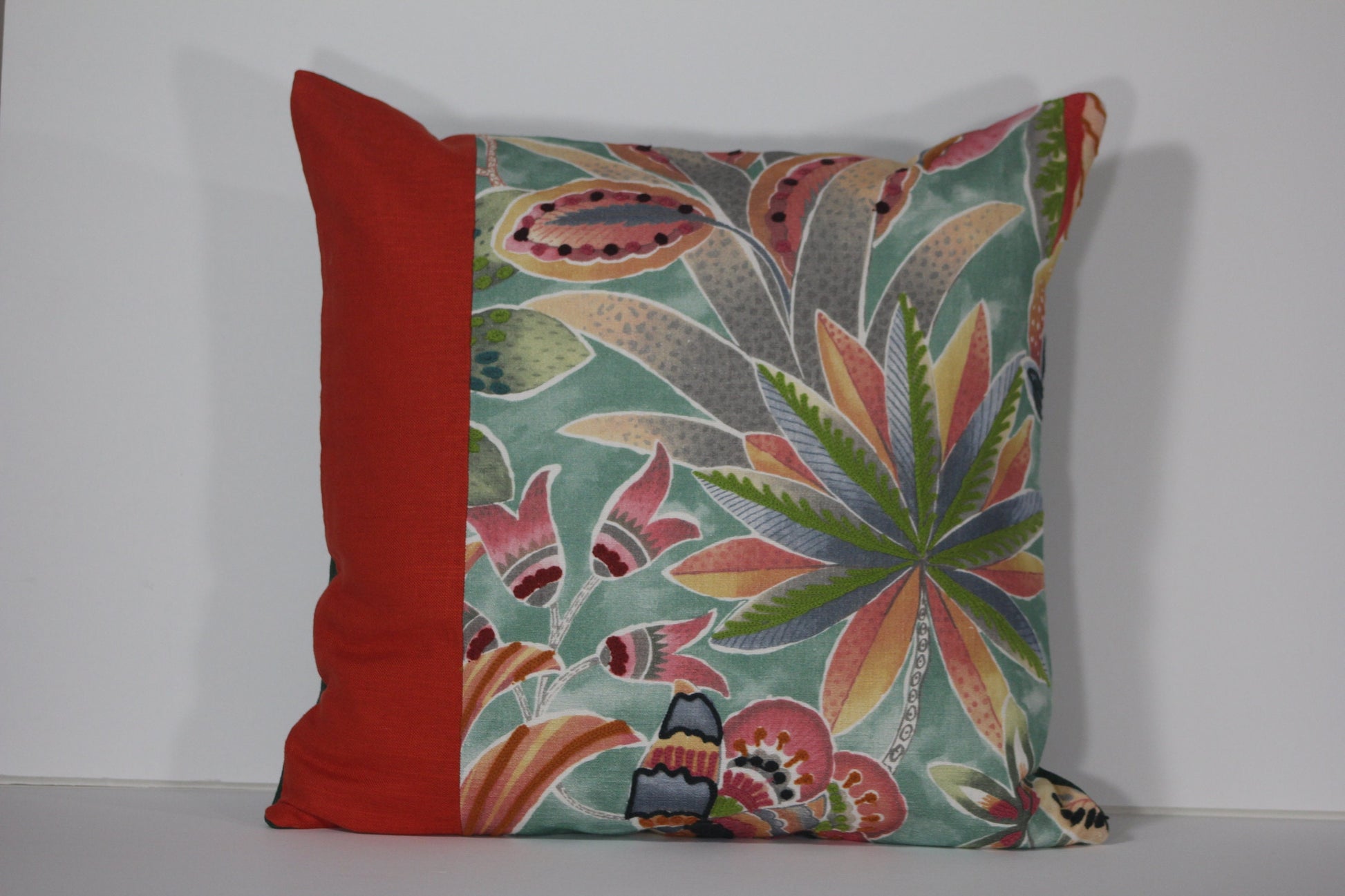 A stunning tropical print featuring crewel embroidery accents is paired with bright orange linen, and backed with an emerald green faux linen poly-blend. It could easily be grouped with the other pillow cover featuring the same tropical and linen fabrics in a slightly different design and/or with the single cover with velvet on the front and the embroidered fabric on the back. All of these pillow covers will bring summery tropical color and texture to your home décor.