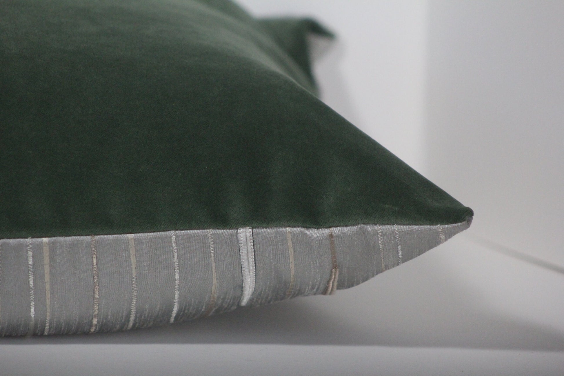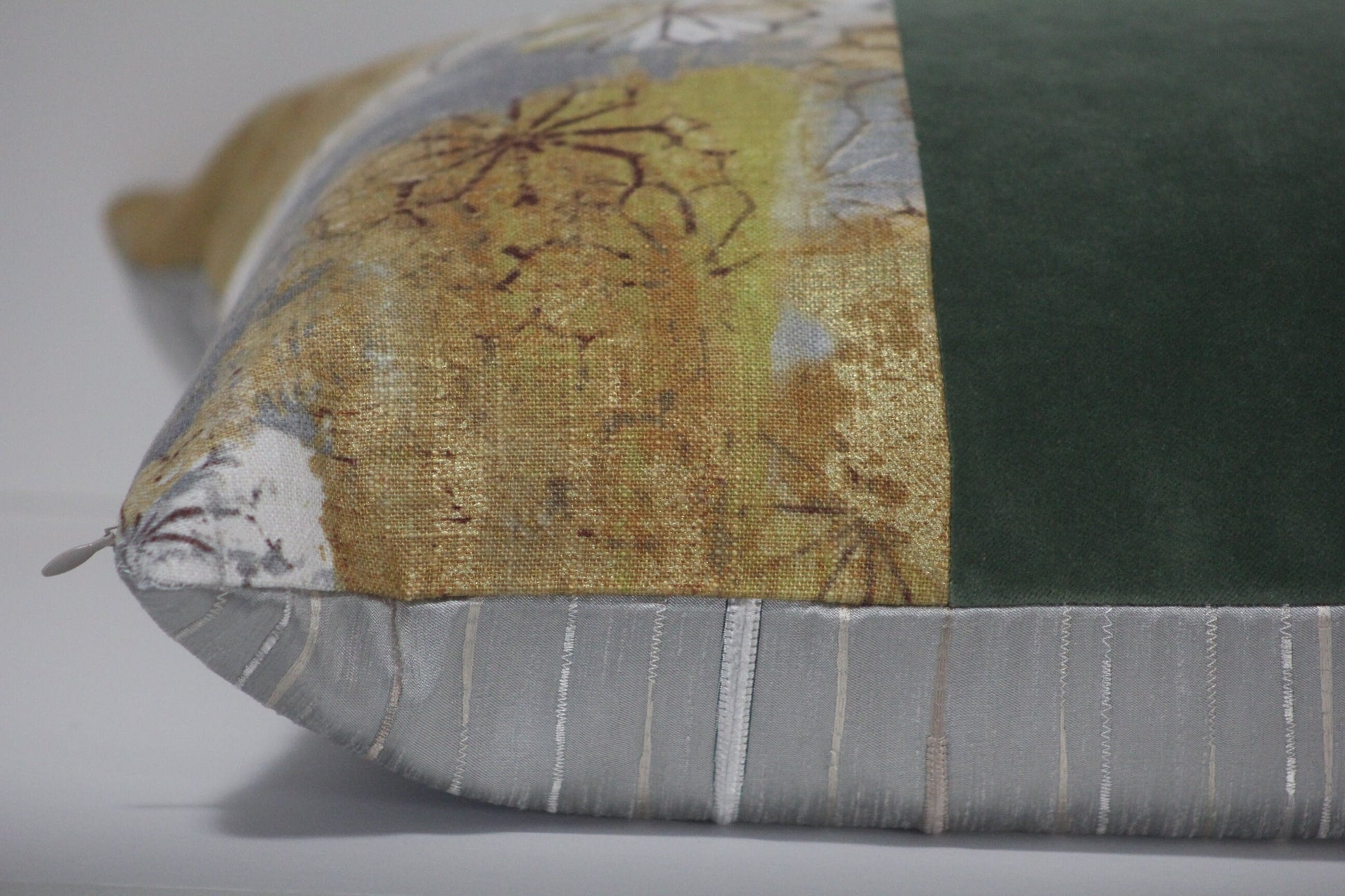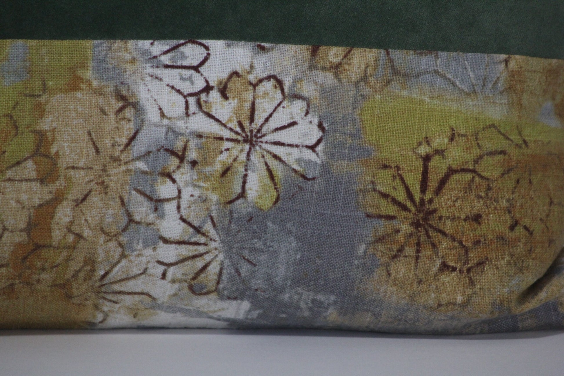 A large panel of soft emerald green velvet is paired with a silver and gold floral print from Covington’s Reactive Dyes fabric line and backed with a textured grey shot silk. We’ve made four unique pillow covers with this same floral print and grey silk back. Alone or combined, they can introduce an autumnal or holiday mood to your room or add a midcentury vibe year-round.