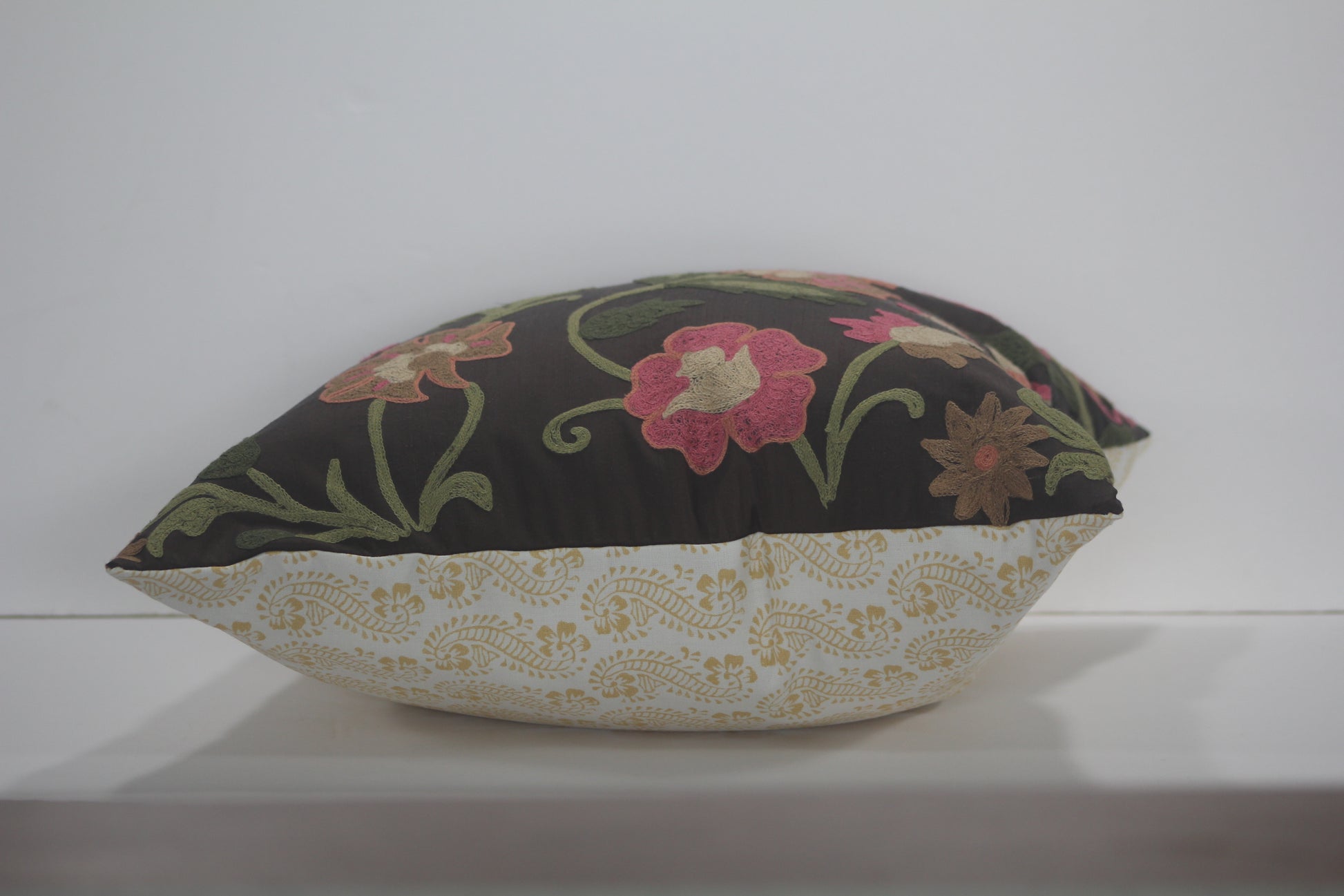 A happy pillow cover with a vivacious and colorful large-scale floral on one side and Molly Mahon’s Lani print on the other side. You decide which is the front and which is the back! The exuberant floral is a highly textured embroidery in orange, coral, pink, ivory, and green on a chocolate brown 100% silk background. The block-print inspired Lani is printed in the turmeric colorway on a blend of 55% linen and 45% cotton. Only four covers are available; design placement will vary.