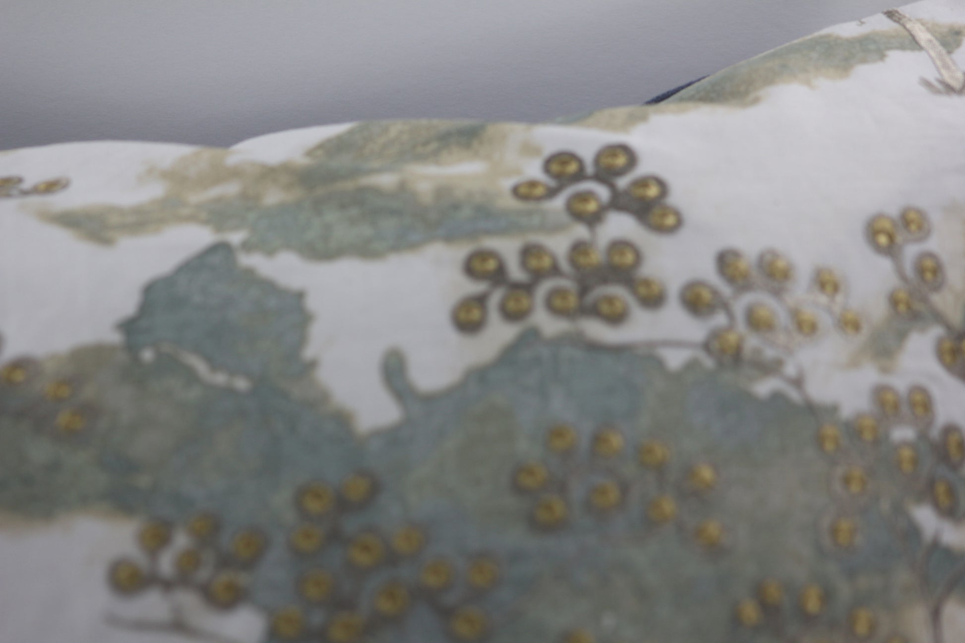 Ann Gish's Avalon, a beautifully subtle landscape design inspired by Arthurian legend with trees and embroidered details in greens and golds, is paired with a single panel of calm brown and blue ombre fabric on the front, and backed with a deep blue cottony fabric. Transport your décor with some quiet yet luxurious texture and color.