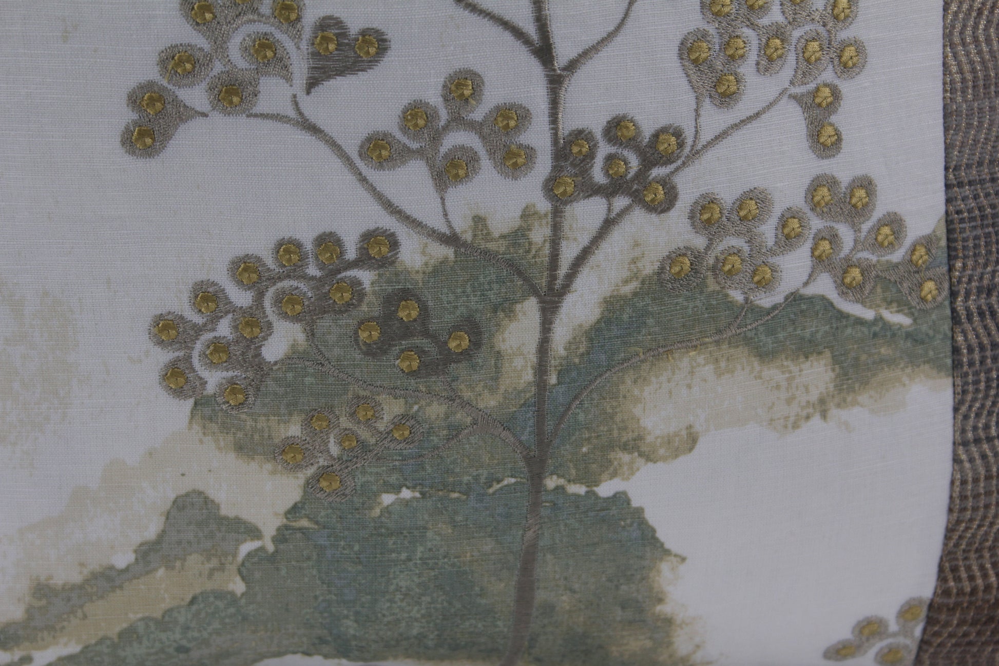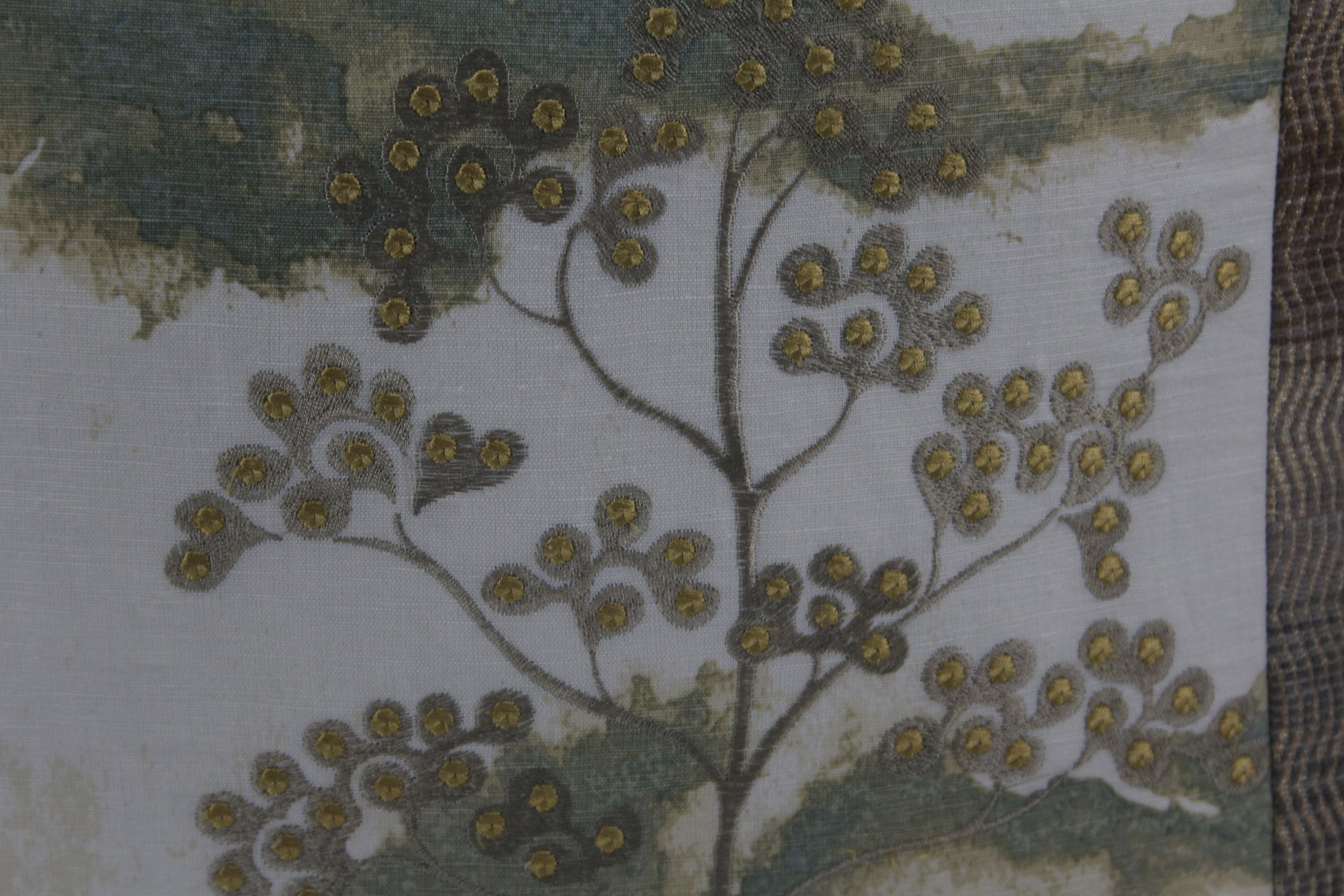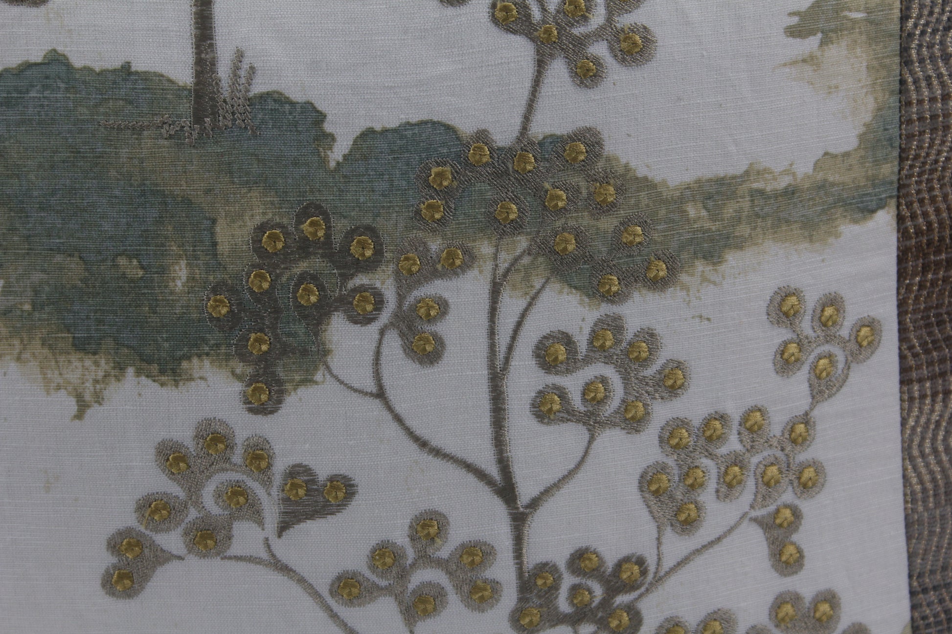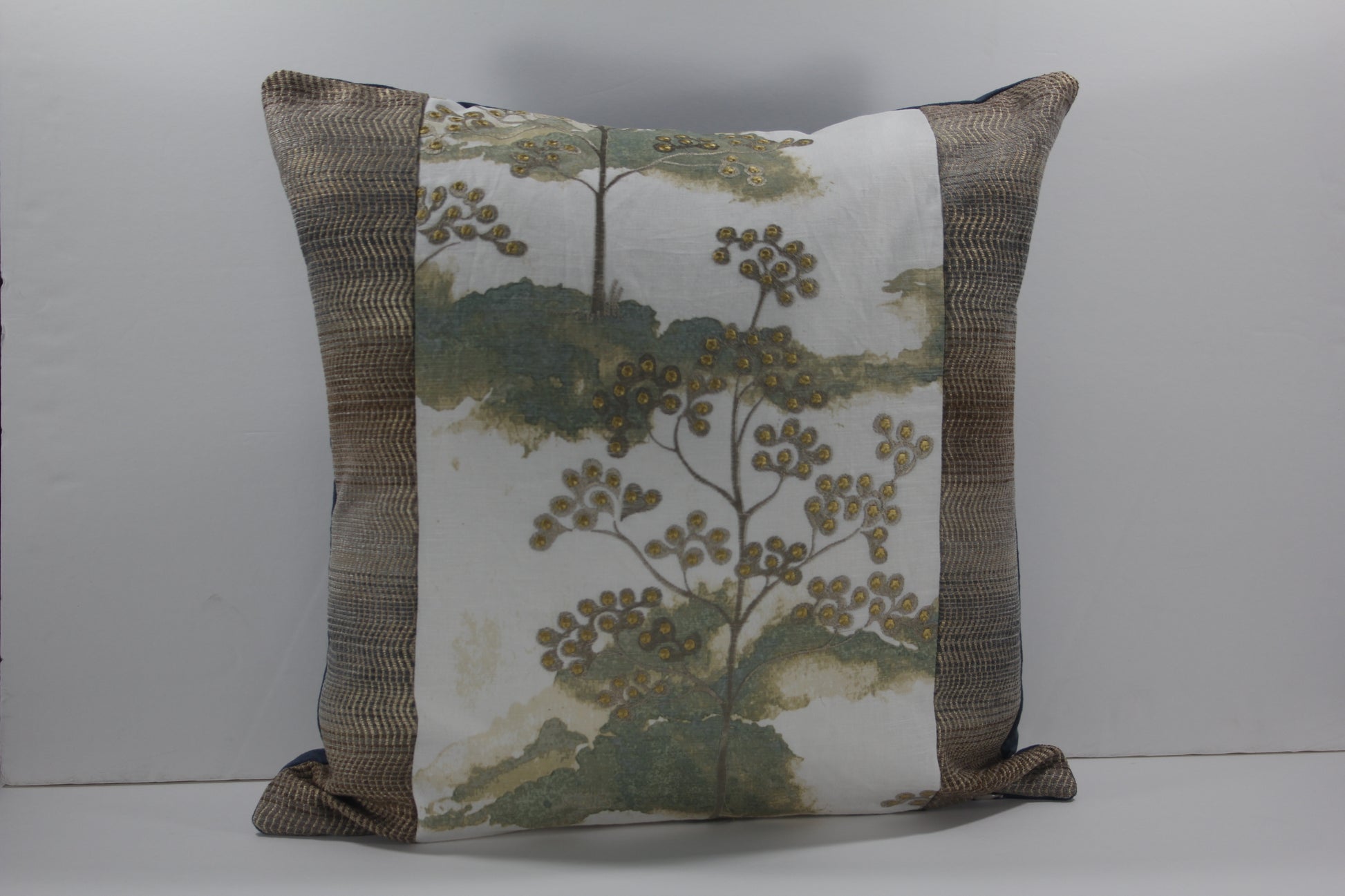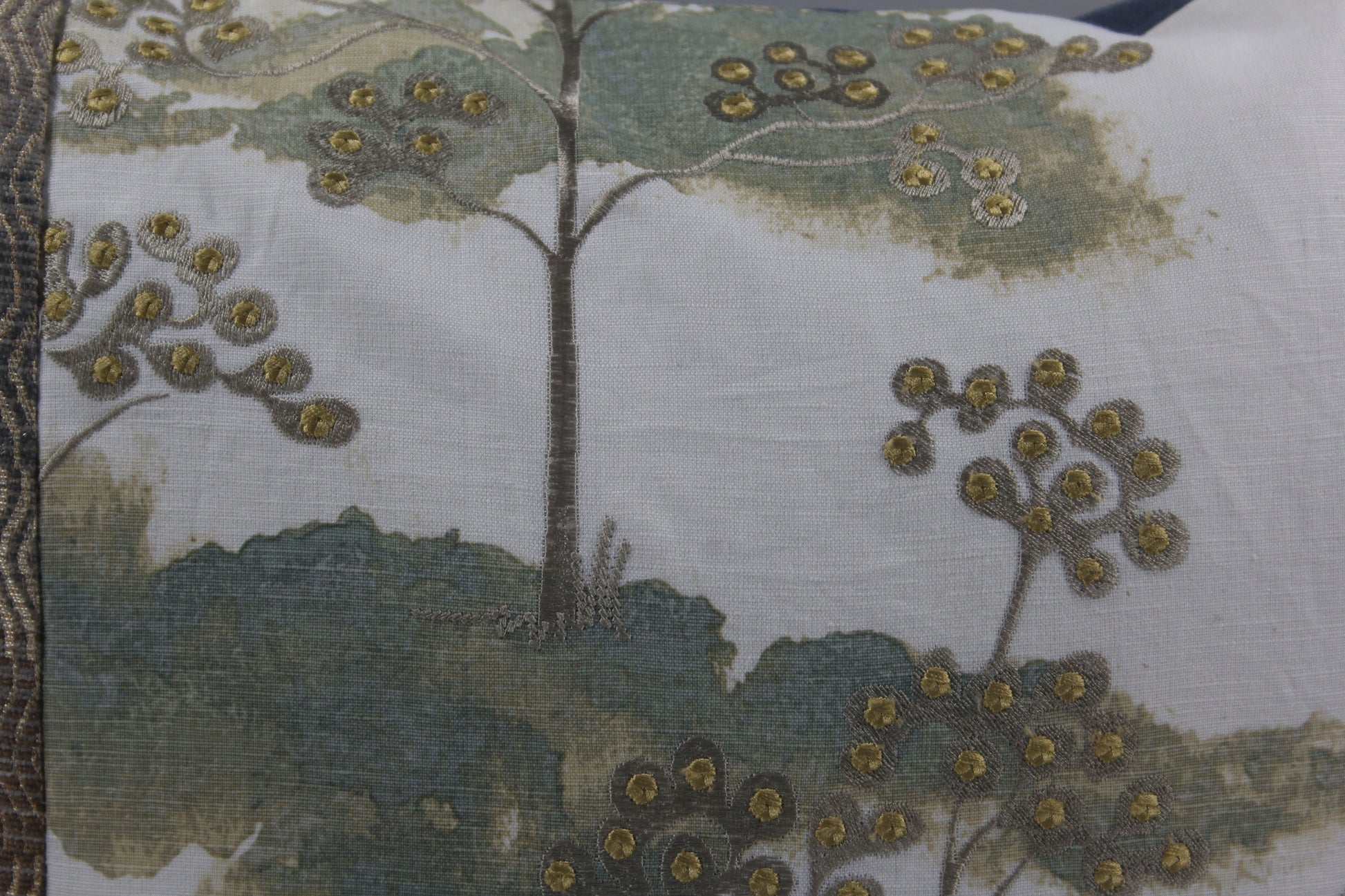Ann Gish's Avalon, a beautifully subtle landscape design inspired by Arthurian legend with trees and embroidered details in greens and golds is paired with panels of a calm brown and blue ombre fabric on the front, and a deep blue fabric on the back. Transport your décor with some quiet yet luxurious texture and color.