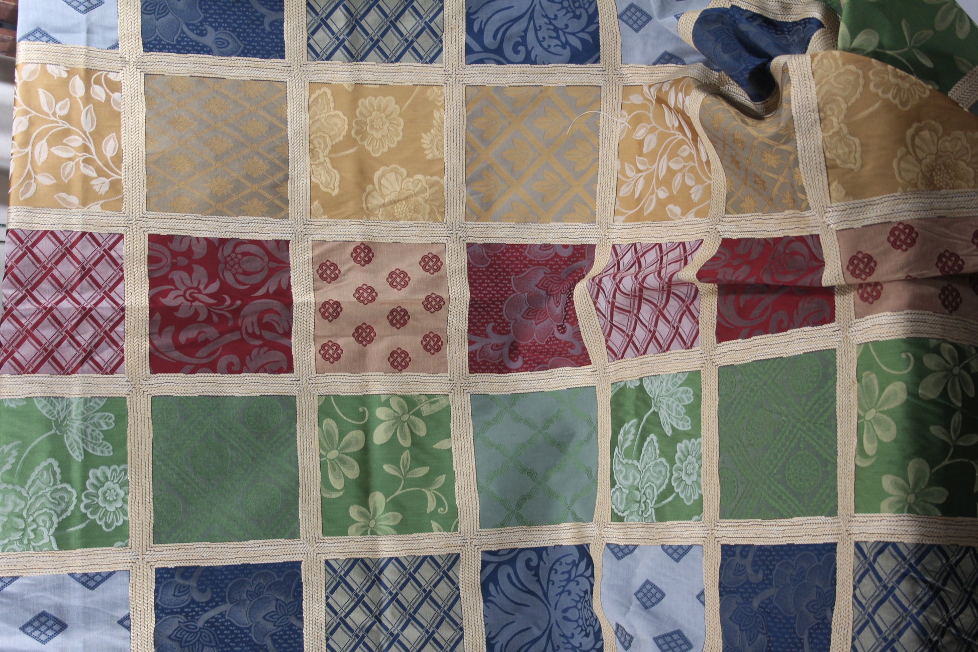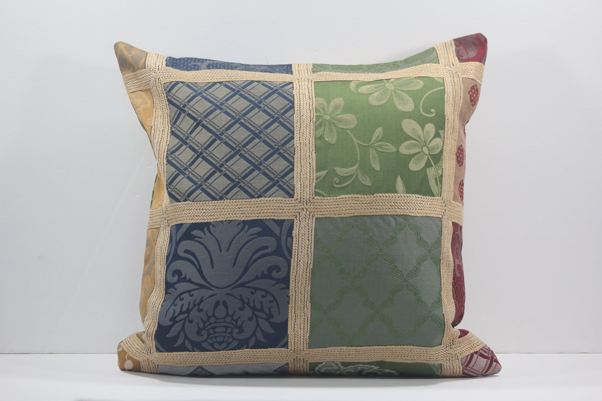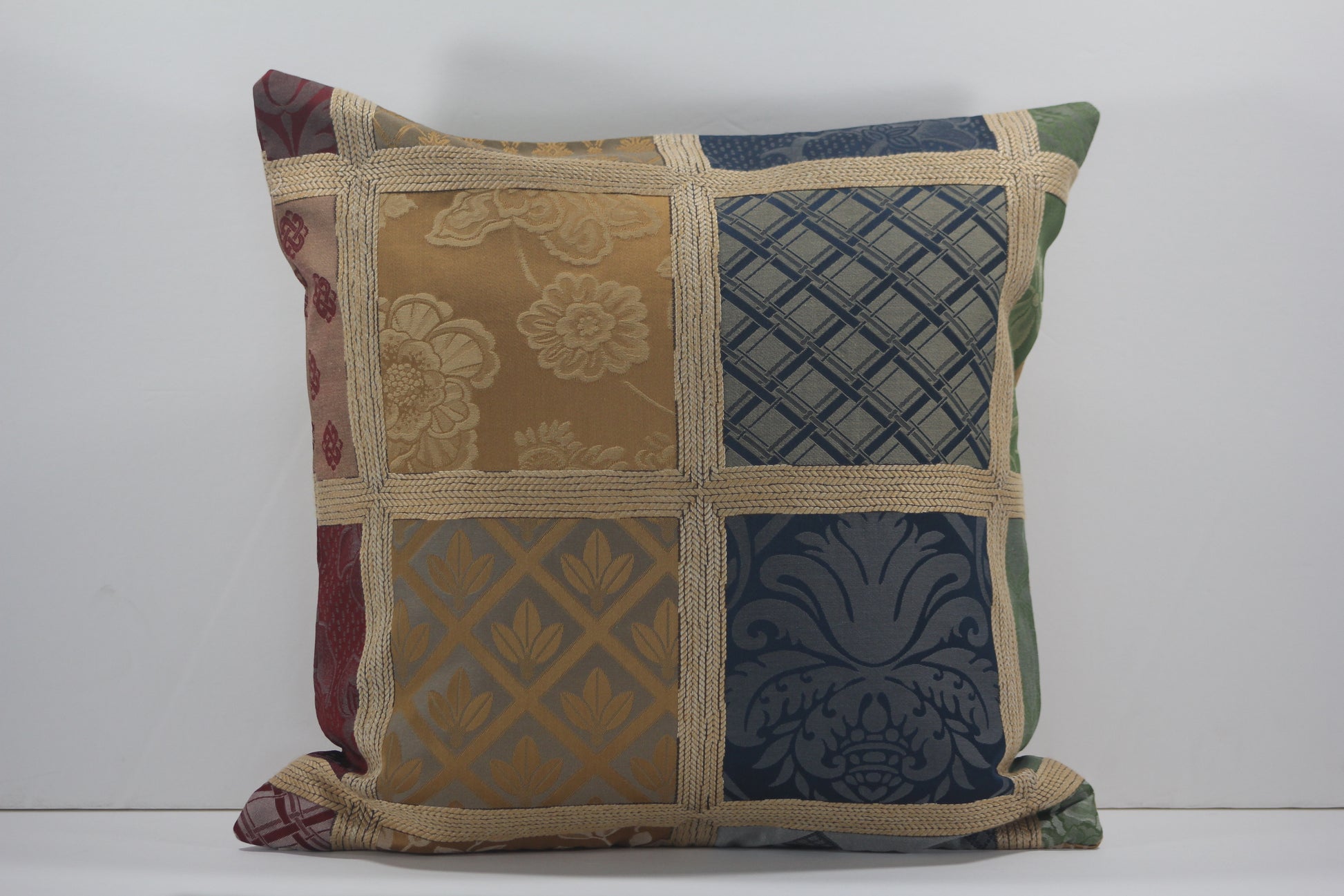 A rich faux-patchwork damask design with panels of deep reds, blues, golds, and greens, surrounded by bands of gold thread. These 18” pillow covers will add a touch of elegance for the holidays or year-round. Design placement will vary.