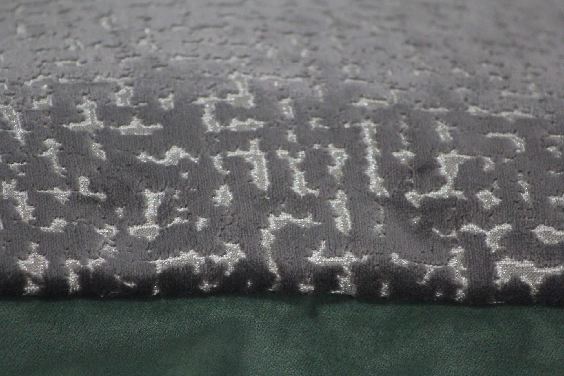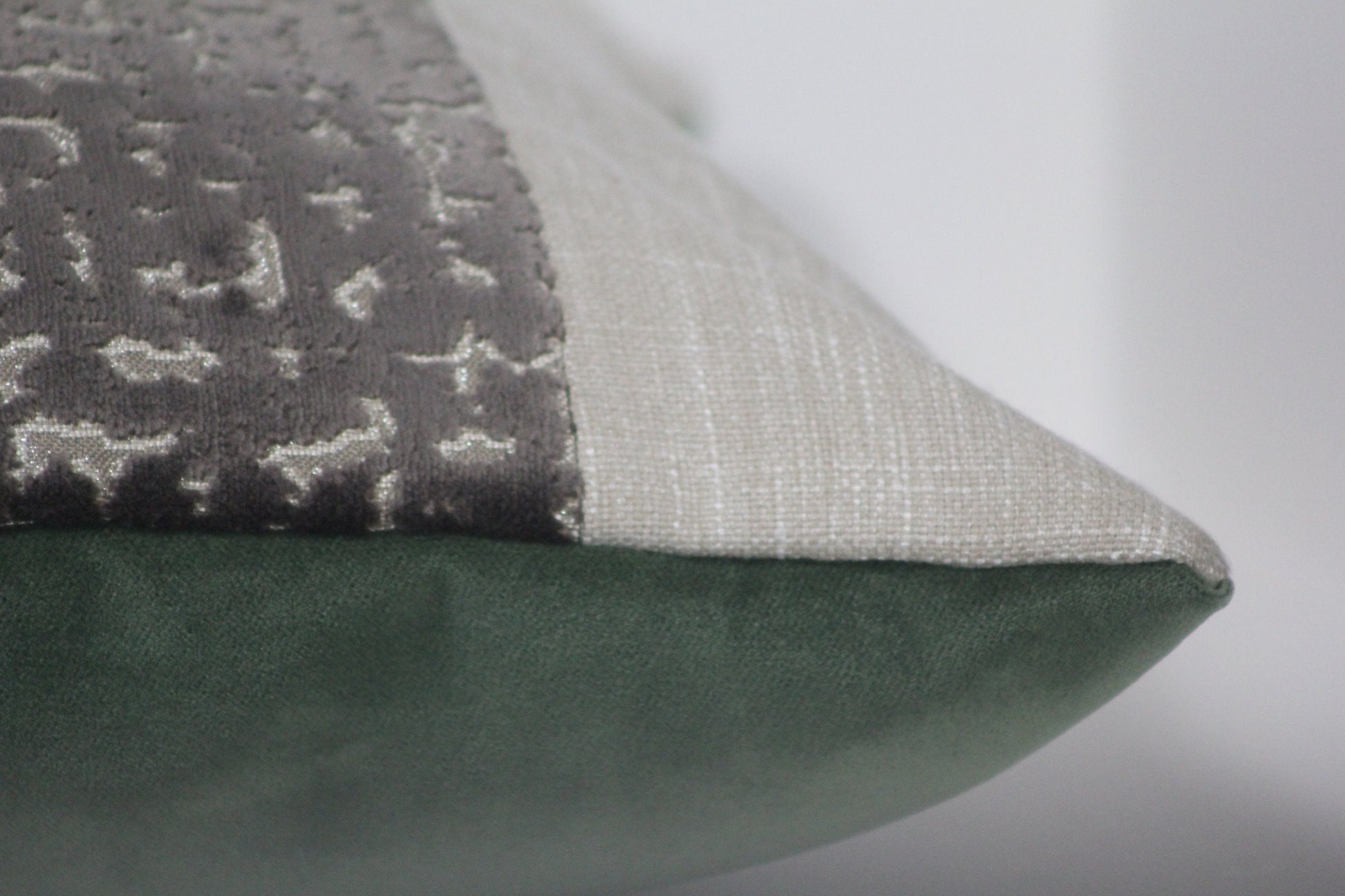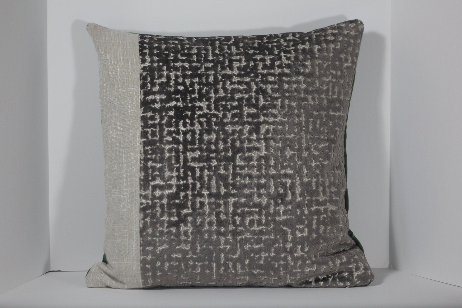 A sumptuous panel of Richloom's Sowa in Espresso, a mushroom brown cut velvet in an abstract design with a bit of sparkle, is paired with a neutral faux linen panel and backed with emerald green velvet. These richly textured and earthy fabrics will bring cozy luxury to any room in your home!