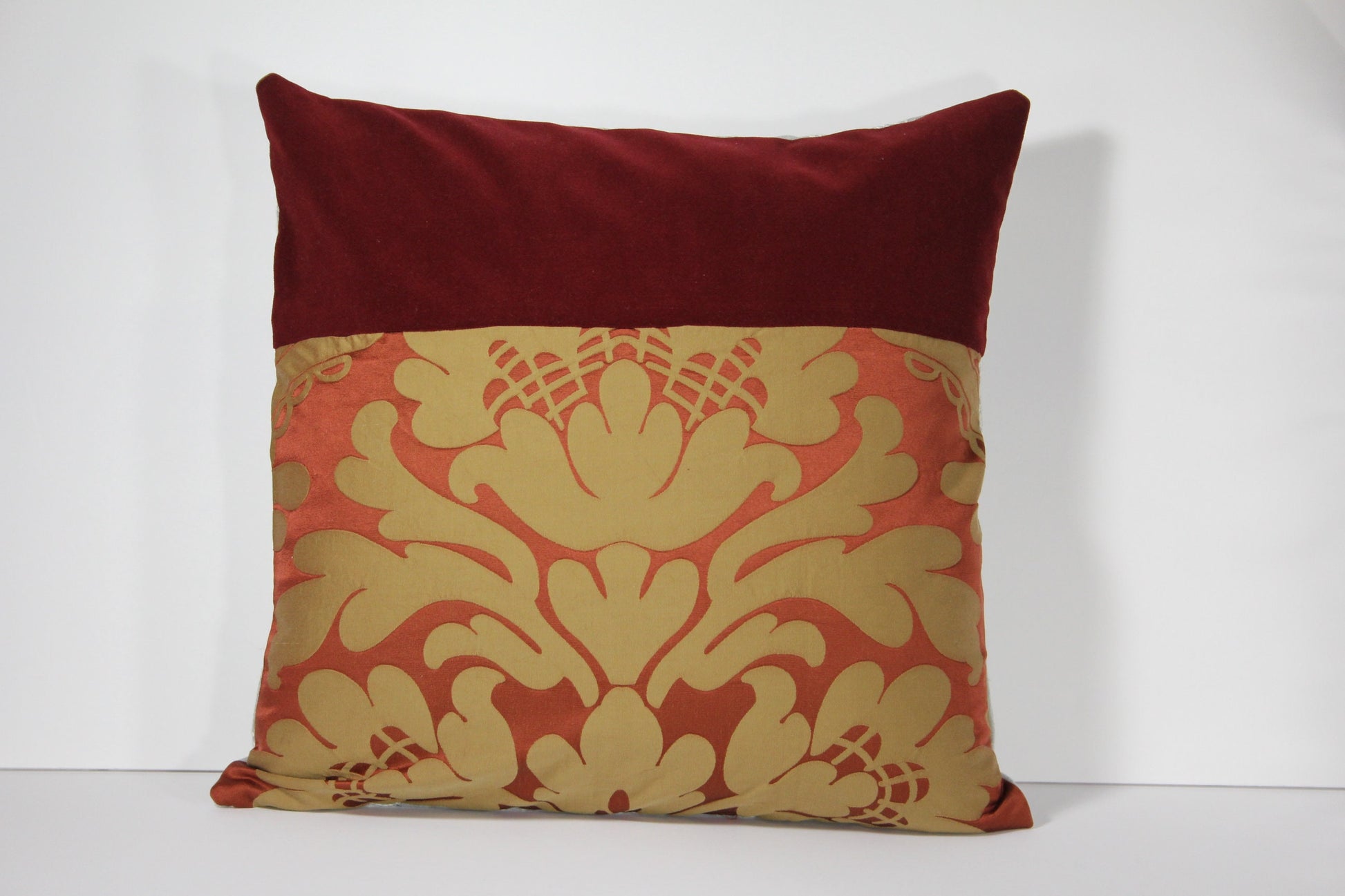 Red Velvet and Orange Silk Damask 20” pillow cover