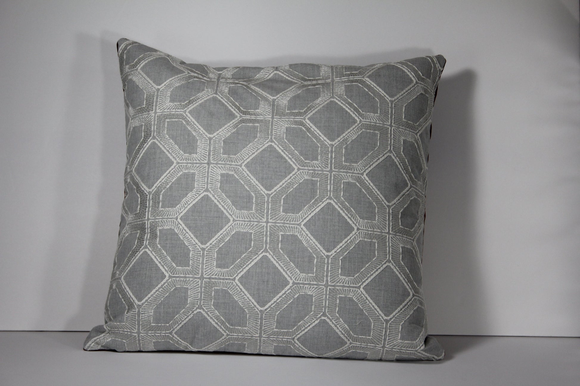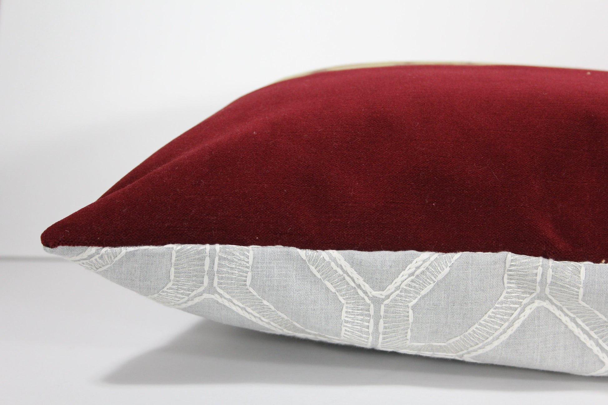 This pillow cover brings together three elemental fabrics to achieve the height of luxury. On the front we pair a magnificent orange silk damask with soft red velvet, for a spicy take on traditional style. On the back, a simpler, yet equally elegant, grey linen embroidered in white.