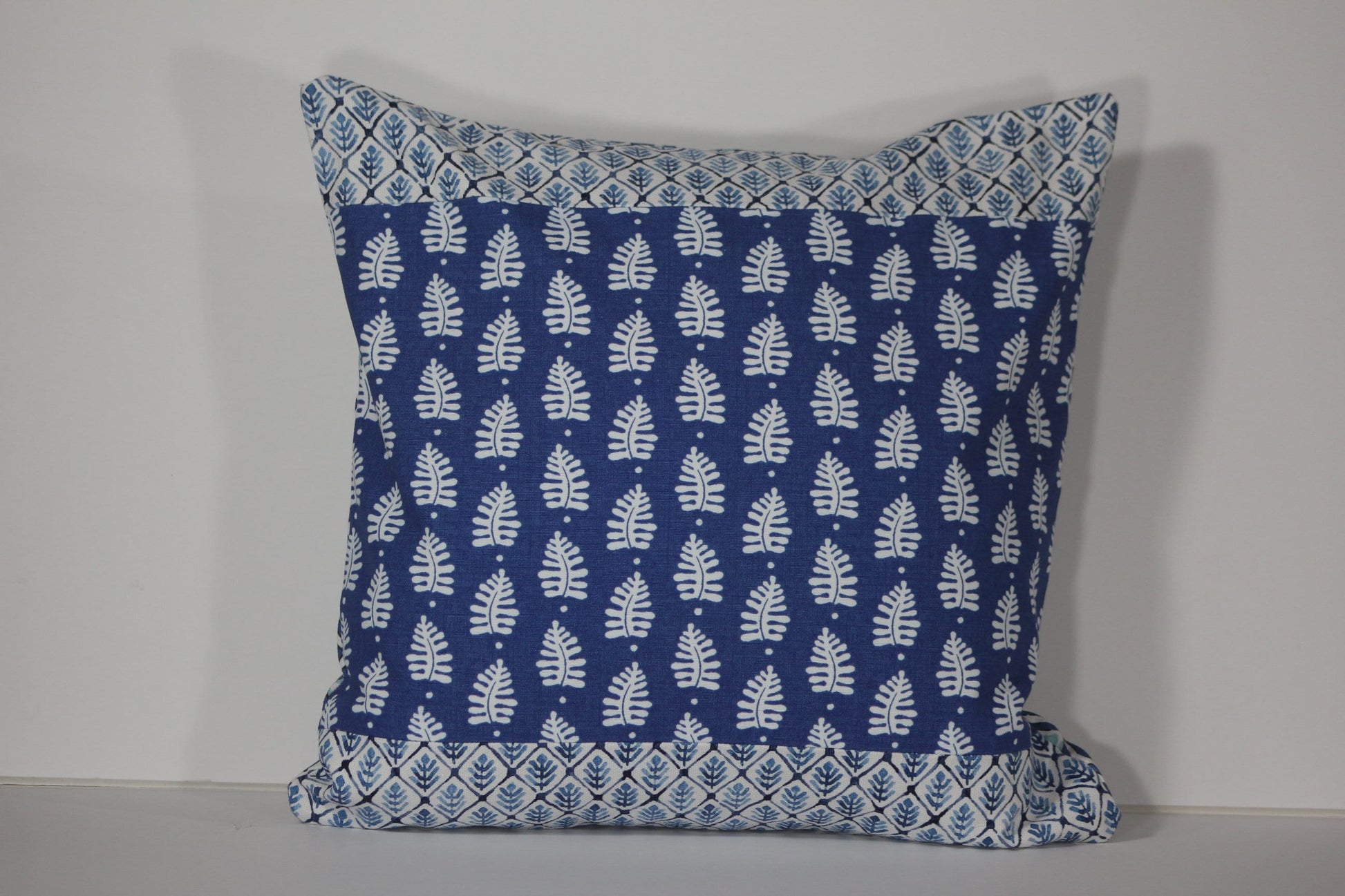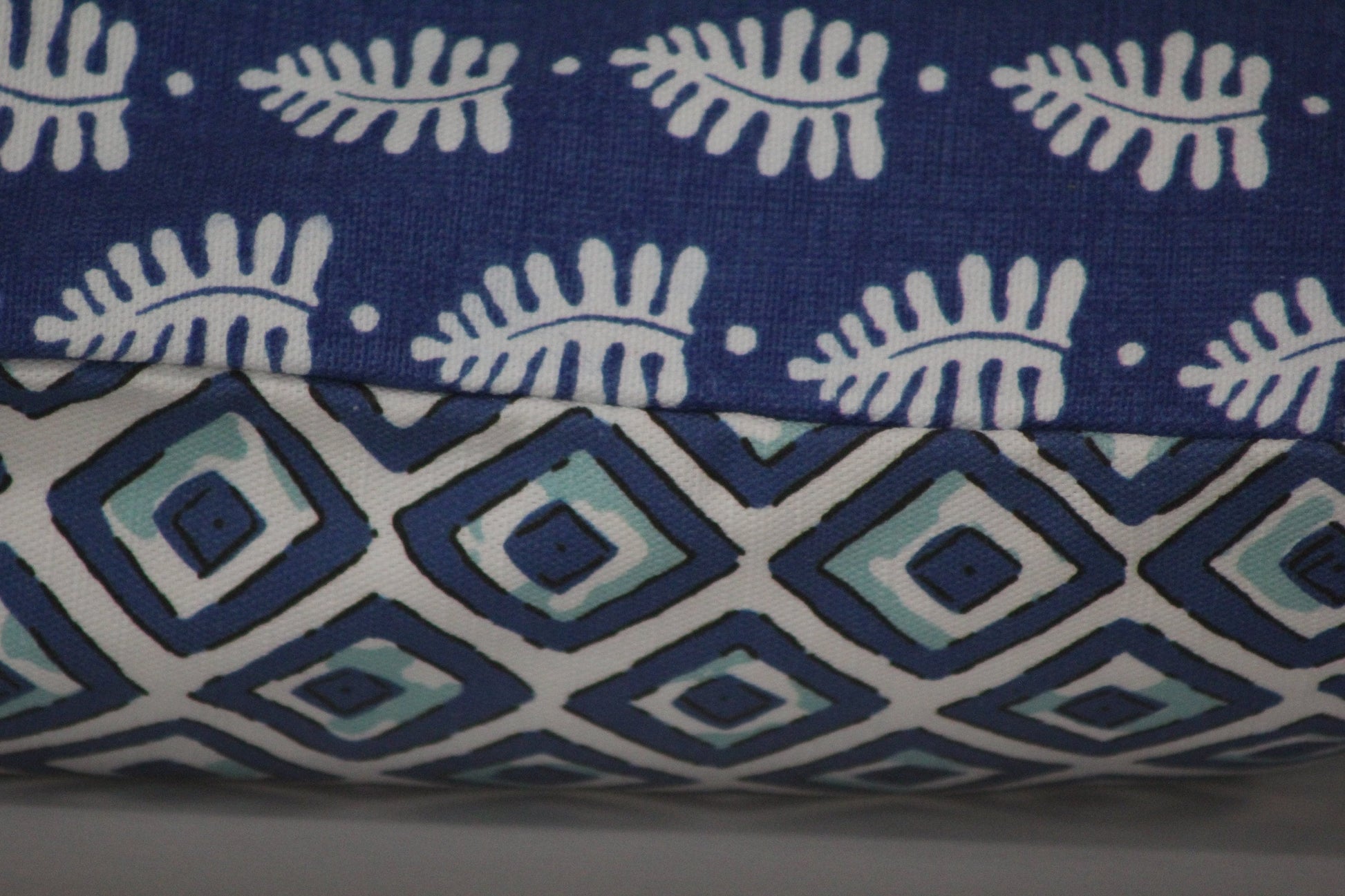 A wide panel of Thibaut’s Ferndale print in blue is paired with bands of Saranac Pine, a Kendall Wilkinson block-print style design for Fabricut, on a one of a kind 20” fully lined pillow cover backed with Thibaut’s Indian Diamond. With its woodland-inspired prints, this pillow, and the similar one we offer, will introduce a fresh and unique moment to any blue and white room, or any room in your home which needs a touch of nature and whimsy.