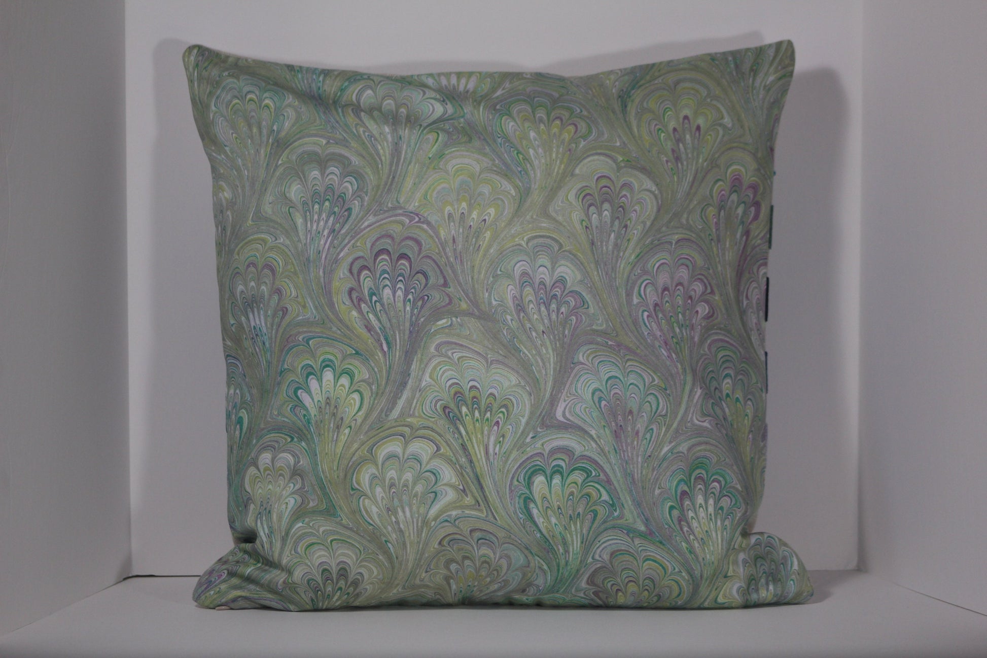 A rich ziggurat design in scales of blue cut velvet is set off by panels of neutral faux linen and backed with an Italian printed cotton in a green and lavender marbleized pattern (a Home Accents design by Ronnie Gold). This unique pillow cover could be the perfect complement to your holiday décor, a blue and white formal room, or anywhere you need a touch of glamour.